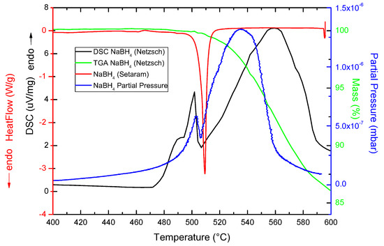 The in-house TPD and the Netzsch DSC (blue and black lines in Figure 1) showed the maximum of the melting point of NaBH4 to occur at around 503 C, in agreement with the literature.
