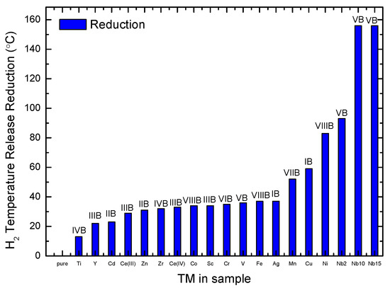 Table 2 summarizes the data obtained by TPD for all the samples. The most important peaks were the main decomposition and melting events of NaBH4. Furthermore, Figure 2 shows the influence of the TM fluoride additive on the NaBH4 decomposition temperature as measured by TPD and represented as the difference in the temperature between the decomposition peak of the sample with additive and that of pure NaBH4.
