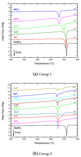 The second group of samples (Group 2 in Figure 3) showed a strong decrease of the melting temperature of the ball-milled samples, which now appeared between 473 and 477 C. In addition, the range of melting temperatures in this group showed a different level of interaction between the TM fluoride additives and NaBH4 and their role in disturbing the intermolecular forces in the borohydride. The samples also showed similar second features after the melting peak, between 482 C at the shoulder in TiF4 and the single peak at 496 C in ZnF2. This second feature occurred at too low temperatures to be associated with NaBH4 decomposition, which was also hindered by the SS crucibles, avoiding gas release. Therefore, it could only be interpreted as processes occurring on intermediate phases created in the mixture during heating. This was also confirmed by the fact that as the intensity of the melting feature decreased, the stronger the feature at larger temperatures became, indicating that some of the NaBH4 in the mixture after milling reacted during heating.