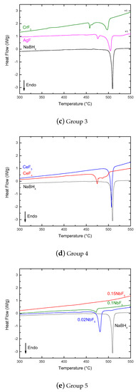 As discussed in Section 2.2.1, DSC-Setaram data of pure NaBH4 showed a strong endothermic event occurring at 509 C that corresponded with melting. Since the Setaram measurements were done in closed SS crucibles (closed system), the decomposition event at higher temperatures was hindered and not seen. The same effect was expected for the samples containing fluoride additives. In Figure 3, the samples are grouped based on DSC-Setaram measurements.