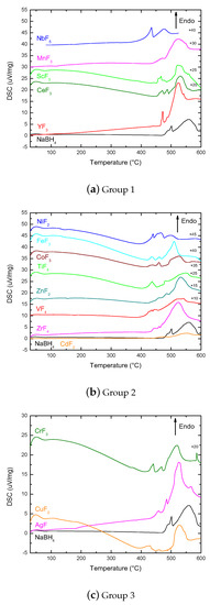 The second group of samples showed a heterogeneous behavior in DSC-Nezsch (Group 2 in Figure 4). This was consistent with the results by TPD and DSC-Setaram showing the variety of interactions between the different TM fluorides and NaBH4. Like in the previous group, the presence of extra features in the melting area mostly indicated phase transformations without gas release, except for ZnF2 and NiF2, which showed a TPD shoulder at lower temperatures than the melting of the NaBH4 feature. These features corresponded to the growing shoulder observed by DSC-Setaram in Figure 3.