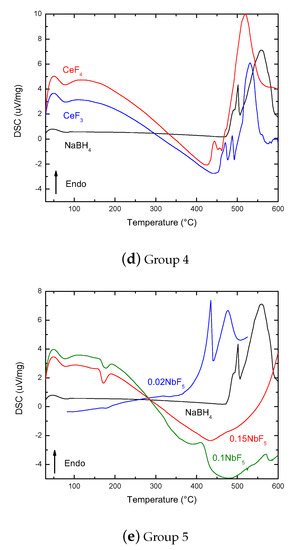 The comparison between CeF3 and CeF4 confirmed the results by DSC-Setaram about the lower oxidation state being less efficient to decrease the melting and decomposition temperatures of NaBH4 (Group 4 in Figure 4). Higher oxidation state systems such as CeF4 packed more F ions around the Ce compared to CeF3. This caused a decrease of the melting point from 817 to 650 C that made the TMF more susceptible to reactions with NaBH4 during milling. This coincided with the fact that the additive with the highest oxidation state, NbF5, resulted in some of the lowest hydrogen melting and desorption temperatures observed. On the other hand, the increase of NbF5 content in the mixture led to the decrease of the intensity of the melting and decomposition features. For 15 mol% of NbF5, the DSC features were lost (Group 5 in Figure 4).
