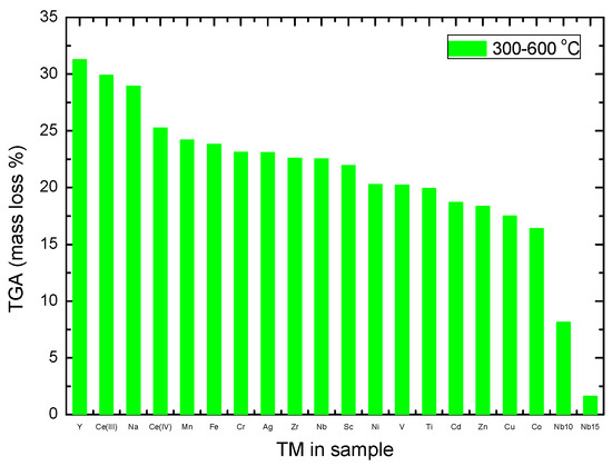 TGA data showing the mass loss between 300 and 600 C for the samples with additive.