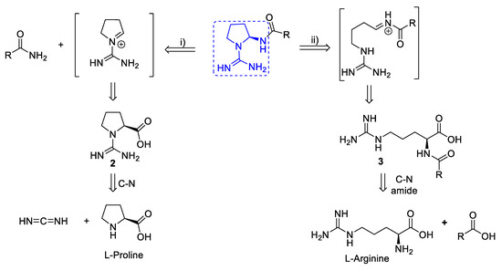 Two complementary strategies were applied for the synthesis of 2-aminopyrrolidine-1-carboxamidine derivatives (Scheme 1) starting from l-proline and l-arginine through their guanidine (2) and acyl derivatives (3), respectively. The delineated synthetic method involves two approaches: (i) oxidative decarboxylation of carbamimidoyl-l-proline (2) followed by the intermolecular trapping of the iminium intermediate by nucleophiles and, (ii) oxidative decarboxylation of (3) followed by intramolecular trapping of the acyliminium intermediate.