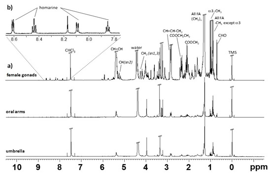 Typical 1H NMR spectrum obtained at 600 MHz of CD3OD/CDCl3 lipid extract of R. pulmo. (a) Full spectrum of three body compartments, and (b) expansion spectrum at high frequency regions obtained only for the female gonads extracts.