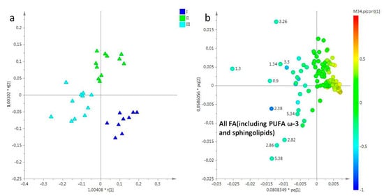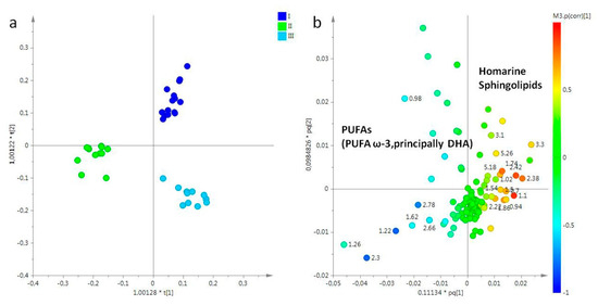 Lipid extracts obtained from female gonads were studied considering three sampling periods (March, May, and July). In particular, the PCA model was obtained considering five principal components, with more than 90% of the explained variance, and R2X = 0.96 and Q2 = 0.91. In the PCA score plot, samples collected in March (I) and July (III) were clearly separated from samples collected in May (II) (data not shown). In order to improve the separation among the different sampling periods, and clearly define the metabolites responsible for the differentiation, the OPLS-DA was also performed. In the OPLS-DA score plot (2+3+0, R2X = 0.95, R2Y = 0.93, Q2 = 0.874), all three groups were clearly distinct. In particular, samples of March (I) and July (III) resulted in positive values of the predictive t[1] component (between 0 and 0.20), while samples collected in May (II) were found a negative values (between −0.1 and −0.3) of the same t[1] predictive component. Moreover, samples from the first sampling period was clearly differentiated from samples obtained in the third sampling (July), along the second component t[2] (Figure 3a). From analysis of loading plot for the model (Figure 3b), samples collected in March (I) and July (III) were characterized by a higher content of homarine and sphingolipids respectively, whereas high levels of PUFAs, including PUFA ω-3 (principally docosahexaenoic acid, DHA), were characteristic of samples collected in May (II).