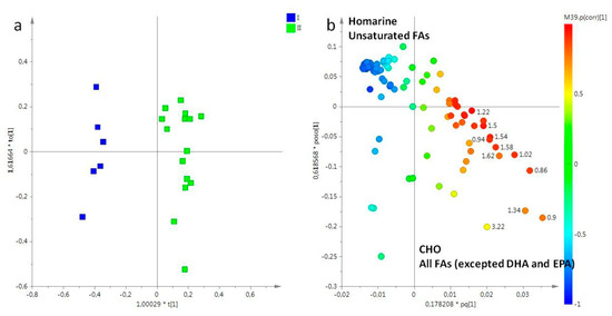 Only two sampling periods (March and May) for both lipid and aqueous oral arm extracts were considered. In the PCA model obtained from oral arm lipid fractions, the t[1]/t[2] PCA score plot showed a good separation of samples (data not shown), with four principal components enough to describe the 90% of total variance of the entire dataset, and R2X = 0.98 and Q2 = 0.97. As already observed in the preliminary PCA, also in this OPLS-DA score plot (1+3+0, R2X = 0.98, R2Y = 0.94, Q2 = 0.90), samples appeared clearly differentiated along the first t[1] predictive component (Figure 5a). In details, the model showed that samples obtained from oral arms collected in March (I) were found at negative values of the first predictive component t[1] (between −0.4 and −0.6), while samples collected in May (II) were positioned at positive values of same component (between 0 and 0.4). By the analysis of the loading plot for this model, it was possible define the original variables responsible of the observed separation (Figure 5b). Specifically, samples collected in the first sampling period (I, March) were characterized by a high relative content of homarine, and unsaturated fatty acids, whereas high levels of CHO, and all FAs, except DHA and eicosapentaenoic acid (EPA), were found in samples collected in May (II).