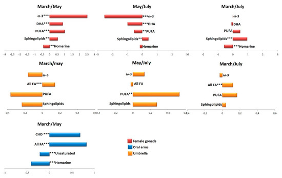 In both extracts, lipid and aqueous, a higher content of metabolites was identified in female gonads with respect to other two compartments. The lipid extract analysis showed a high content of ω-3 PUFAs, as also observed by other authors in different species of scyphozoan jellyfish, such as Aurelia sp. [3,4,8,30]. The high content of PUFAs (essentially ω-3 and ω-6 PUFA) in these organisms could represent an important source as essential dietary nutrients for marine invertebrates and fish, since these cannot synthesize PUFA de novo from saturated and monounsaturated fatty acids [31]. Moreover, as reported in the literature, ω-3 PUFAs, especially DHA and EPA, are abundant in the gonads of marine invertebrates [32], including also scyphomedusae, as these molecules are required in the gonad maturation [33], larval growth of fish [34], reproduction processes, and for egg quality [4,35], regulation of cellular movement, gonadal metabolism of lipids, and fusion capacity [36]. Indeed, the lipid content strongly influenced the composition of fish eggs [37]. Moreover, it has also been reported that, in different species, such as Octopus vulgaris, the lipid gonad metabolism was regulated by the PUFA content [36]. In other organisms, such as crustaceans and molluscs, PUFAs are also involved in prostaglandin and hormone production and ionic flux regulation [4]. In some jellyfish species, such as Aurelia sp. and R. pulmo ovaries, EPA and DHA fatty acids (FAs) were detected, where palmitic and stearic fatty acids (16:0 and 18:0, respectively), EPA, AA, and DHA (eicosapentaenoic, arachidonic, and docosahexaenoic acids, respectively) constituted around 66% of the total FAs [38,39]. Since antioxidant and anti-inflammatory properties of ω-3 PUFAs, DHA, and EPA are suitable for treatments of neuro-inflammation-induced memory deficits and mental health [40,41], the exploitation of ω-3 PUFAs found in DHA and EPA of the R. pulmo gonads as sources of these compounds could be promising in pharmaceutical and nutraceutical fields. The observed differences in lipid content might be due to a variation in the size and age of individuals and/or the temperature of the living biota and habitat, as already observed in Aurelia aurita [38]. In particular, Lucas et al. [42] summarized the most common life history patterns in temperate waters explaining that juvenile medusa (ephyrae) are liberated in late winter and develop into medusae in the spring. As the temperature increases, the medusae reach the maximum size of 20–30 cm bell diameter [42]. During summer, the medusae start to shrink as they release eggs. Their life span is mostly 4–8 months. Accordingly, the life cycle of R. pulmo begins with a fertilized egg that develops into a planula and, hence, into a sessile and asexually-reproducing scyphistoma, which strobilates and releases swimming ephyrae that develop into medusae. Previous studies on the seasonal distribution of R. pulmo along the Catalan coast and the coastal lagoon on Mar Menor (NW Mediterranean) [43] evidenced that the adult medusae normally disappeared during January and March and that the juvenile R. pulmo (about 5–10 cm umbrella diameter) was observed at the beginning of May. On the basis of these observations, it is plausible that the observed differences in lipid concentration could be related to the maturity of the eggs in the collected jellyfish. In particular, in March the juveniles have not yet reached the sexual maturity and eggs have a different composition compared to those of April/May, when jellyfish are ready to mate. In this context, it is also intriguing to consider that in jellyfish, an increase in the amount of sunlight at dawn causes males and females to release sperm and eggs, respectively, into the water at the same time, therefore improving the chances of fertilization. In female jellyfish, the rise in the amount of sunlight falling on the cells surrounding the oocyte—the future egg—also stimulates the final steps in the process of egg production [44,45,46]. It should be noted that at our latitude (Ionian Sea, 40°25.7′ N, 16°53.1′ E; Italy) this situation could be reached just starting from May. After the spawning period the female gonads have low contents of unfertilized eggs and this could be reflected in the observed 1H NMR profiles. Interestingly, the results obtained in the present study are also in accordance with several studies on the biochemical composition of eggs in marine invertebrates, showing that mature eggs often are characterized by a high lipid and protein content.