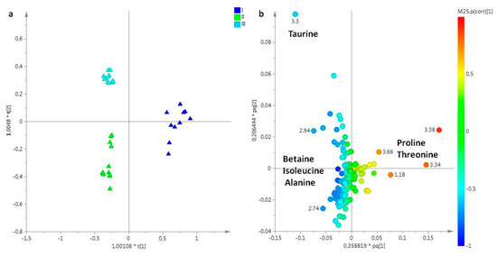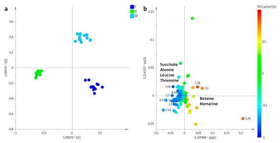(a) OPLS-DA t[1]/t[2] scores plot of for aqueous extracts of female gonads of R. pulmo collected in different sampling periods: blue circle, March sampling (I); green circle, May sampling (II); sky blue circle, July sampling (III). (b) Loading plot for the model; the variables indicated ppm in the 1H NMR spectrum.
