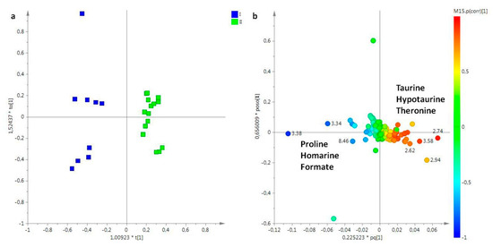 Similarly to oral arms lipid extracts, for aqueous extracts only March and May sampling periods were considered. The unsupervised analysis gave a good model R2X = 0.89 and Q2 = 0.42 and only three components described more than 74% of the total variance (36%, 30%, and 8.8% for t[1], t[2], and t[3], respectively). In the corresponding t[1]/t[2] PCA score plot, the samples collected in March and May (I and II) were well separated, along the t[2] principal component (data not shown). The equivalent OPLS-DA model (1+1+0, R2X = 0.54, R2Y = 0.95, Q2 = 0.91) improved the separation among samples along the predictive component t[1], from negative (between −0.2 and −0.6) to positive values (between 0.2 and 0.4) for samples collected in March (I) and May (II), respectively (Figure 9a). From the analysis of the loading-plot for the model (Figure 9b), a high relative content of proline, homarine, and formate was found in oral arms of March period, whereas a higher relative content of taurine, hypotaurine, threonine, and glycine was observed in samples collected in May.