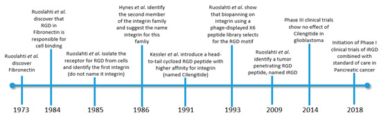 A head-to-tail cyclized version of RGD was developed by Kessler and collaborators in 1991 [27,113]. The authors introduced a d-aminoacid that induced a defined conformation and this facilitated head-to-tail cyclization. It was the cyclization and not the introduction of additional D-aminoacids that potently increased the binding activity of this cyclic RGD. The most used and studied variant of the cyclized RGD is denoted cyclo(RGDfV), where f is d-phenylalanine and V is valine. The peptide cyclo(RGDfV) was later commercialized for research use under the name cilengitide. Cilengitide alone proved to be effective in reducing glioblastoma in mice [114] and also in phase I and II clinical trials [115], presumably because of its anti-angiogenic effects [113]. However, in phase III clinical trials cilengitide did not show an effect on survival [116] and its development was halted. The reasons for the failure of this phase III were suggested to be related to the poor pharmacokinetics of this small peptide (which was given intravenously) and an ineffective administration regime [117]. The milestones in the genesis and evolution of RGD in tumor targeting are schematized in Figure 1.
