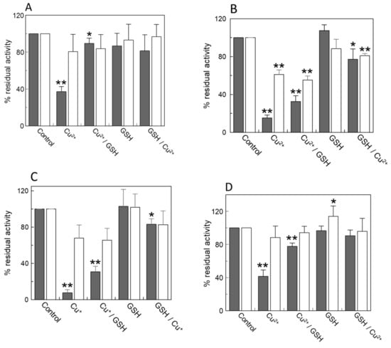 Effect of copper and reduced glutathione (GSH) on native and recombinant carnitine/acylcarnitine carrier (CAC). (A) Rat liver mitochondria (5 mg/100 μL) were incubated or not (control) for 1 h, with CuCl2 (50 µM) or GSH (5 mM) as indicated. After washing, mitochondria (0.3 mg) were then solubilized with 3% TX-100, 10 mM PIPES pH 7.0 and reconstituted in proteoliposomes for transport assay as indicated in Materials and Methods. (B) The CAC was treated with CuCl2 or GSH after extraction from mitochondria, as indicated, and then reconstituted in proteoliposomes. Unreacted reagents were removed by gel filtration chromatography (Sephadex G-75) as described in Materials and Methods. (C) All the conditions were the same as in (B) except that CuCl was used instead of CuCl2. (D) Purified crude rat liver mitochondria (5 mg/100 μL) were incubated for 2 h with 20 mM carnitine and washed three times with a buffer containing 150 mM sucrose, 50 mM TRIS-HCl and 50 mM KCl. After treatment for 1 h with CuCl2 (50 µM) or GSH (5 mM) the transport activity of CAC on intact mitochondria was measured by adding 0.05 mM [3H]-carnitine. The uptake was stopped at 30’ by three washes with cold 1 mM NEM added to the same buffer used before. In all panels, black bars and white bars indicate without or with the addition of 5 mM dithioerythritol (DTE) 1 min before the transport assay to aliquots of each sample. The data are expressed as a percent of the controls (without any addition) and are means ± SD from three independent experiments; significantly different from the respective control as estimated by Student’s t test (* p < 0.05, ** p < 0.01).