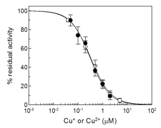 To gain information on the affinity of the CAC towards the copper ions, a dose-response experiment was performed by measuring the residual transport activity of the CAC extracted from mitochondria, after incubation with different concentrations of Cu2+ or Cu+ (Figure 2). The data indicated that both the copper forms inhibited the CAC and that the affinity of the protein for the ions was similar, with a calculated IC50 of 1.6 ± 0.14 µM or 1.5 ± 0.26 µM for Cu2+ or Cu+, respectively.