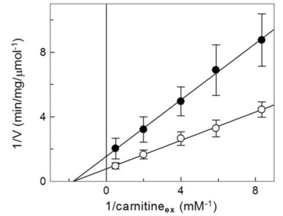 Kinetic analysis of the inhibition by Cu2+ of the recombinant CAC. The carnitine/carnitine antiport rate was measured, as described in Materials and Methods, adding [3H]carnitine at the indicated concentrations to proteoliposomes containing 15 mM internal carnitine in the absence (○) or in the presence of 1 μM CuCl2 added together with the labelled substrate (●). The transport was stopped after 10 min (i.e., within the initial linear range of the time course, see Materials and Methods) by 1.5 mM NEM. Experimental data are plotted according to Lineweaver–Burk as reciprocal transport rate vs. reciprocal carnitine concentrations. Values are means ± S.D. from three independent experiments.