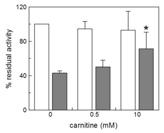 Protection by substrate of the CAC inhibition by Cu2+. Carnitine at the indicated concentrations was added to proteoliposomes, and then the mixture was incubated for 1 min with (grey bars) or without (white bars) the addition of 0.5 μM CuCl2. Unreacted compound was removed by passing the proteoliposomes through Sephadex G-75 columns (see Materials and Methods). Transport was then started by adding 0.1 mM [3H]carnitine to the proteoliposomes and stopped after 10 min. Percent residual activity is reported with respect to the control without the addition of CuCl2. The data are the means ± SD from three different experiments; significantly different from the respective control as estimated by the Student’s t test (* p < 0.05).