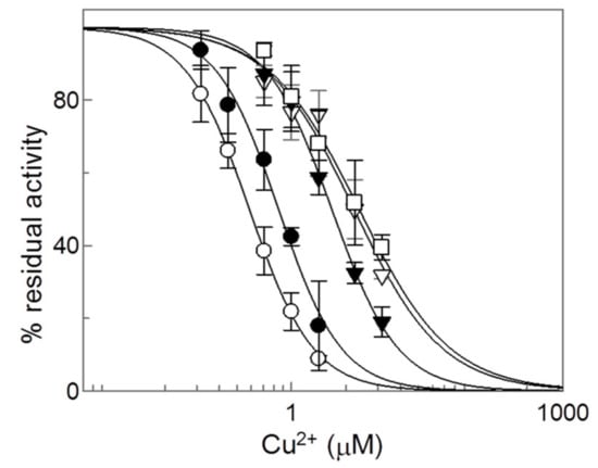 The sensitivity to Cu2+ was strongly decreased in the mutants C136S and C155S, indicating that the two Cys residues played an important role in the interaction. The IC50 was indeed about one order of magnitude higher than that of the WT. To confirm the involvement of the two residues, the double mutant C136/155S was tested for inhibition. Additionally, in this case, a ten times higher IC50 value was found. As further positive proof for the crucial role of the two Cys residues, a mutant containing only C136 and C155 (C23S/C58S/C89S/C283S) was tested. In this case, a strong inhibition was again observed, even though the IC50 value was somewhat higher than in the WT. The data indicate that the inhibition of the CAC was not due to oxidation of thiol groups of the C136 and C155 by Cu2+ but by interaction with two Cys residues, namely C136 and C155 forming a sulfur–metal bond. The substitution of the crucial Cys residues with Ser, indeed, decreased the strength of the bonds. The finding that the increase of IC50 was maximal upon substitution of both the critical Cys residues lets us hypothesize that the copper ion may form a cross-link with the two Cys residues.