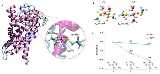 To gain further insights into the formation of Cu2+ or Cu+ cross-link with thiol groups of Cys residues, a computational approach was employed. In fact, the conformational behavior of apo-protein WT CAC (Figure 7) was analyzed for all the 200 ns of productive molecular dynamics simulation (MDs). In particular, a careful examination was devoted to the orientation of all the cysteine residues present (C23, C58, C89, C136, C155 and C283) for WT-CAC and also for its C136S and C155S CAC mutated forms. Results reported in Supplementary Figures S2–S4 show the C136 and C155 residues lie at an average distance between the sulphur atoms (S–S) equal to 10.0 Å with a minimum of 4.98 Å (Figure 7A). This distance value is coherent with possible coordination of Cu2+/Cu+ metal ion by the sulphur atom of cysteine, as reported in the literature for other proteins [17,18]. With the aim to obtain atomistic insights about this aspect, smaller model systems (Cu+–(CH3S(H))2(H2O)2) and (Cu2+–(CH3S(H))2(H2O)2), depicted in Figure 7B, were undertaken to carry out an investigation at density functional theory (DFT) level. The optimized coordination distances well depicted what was observed during the MDs. Further details on the Cu2+ and Cu+ ions binding affinity of the thiol group were given by checking the effect on the energy due to the gradual substitution of -SH by -OH simulating the serine side chain (Figure 7C and for the corresponding optimized species see Supplementary Figure S5). The ΔH became higher (from right to the left of Figure 7C) when the thiol groups were replaced by hydroxyl ones, suggesting a better affinity of the copper ions for -SH group in accordance with what the hard–soft acid–base theory proposes. The computational data correlated well with the data obtained with the site-directed mutants and were in favor of the formation of two S–Cu2+/+ bonds with the thiol groups of C136 and C155. By assuming that the used models (a, b and c of Figure 7C) are representative of the apo protein, their relative deprotonation energies reflected the effect of the Cu2+/Cu+ binding on the acidity of the coordinated thiol groups (Figure S5) as analogously found in other proteins [19,20]. All the experimental and the computational data concurred in explaining the mechanism of inhibition and correlated well with previous data showing that C136 and C155 are involved in conformational changes required for the transport process [10,11,12,16,21,22,23,24].