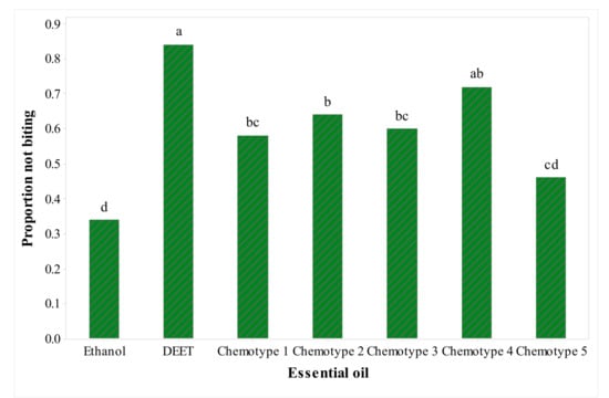 Biting deterrent activity of the essential oils of different chemotypes of S. pilosa is presented in Figure 1.