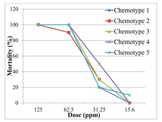 All the EOs, except chemotype five (carvacrol), showed biting deterrence above the ethanol control. Biting deterrent activity of chemotype four (carvacrol, p-cymene and γ-terpinene) with proportion not biting (PNB) value of 72 was similar to DEET (Figure 1). All the five EOs representing the five Satureja chemotypes tested in this screening bioassay showed larvicidal activity against 1-d old Aedes aegypti. The mortality in all the four EOs was similar. At the lowest dose of 15.6 mg/kg, chemotype five gave 10% mortality whereas the other essential oils did not show any mortality (Figure 2).