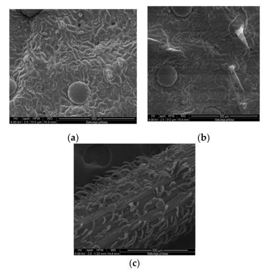 A glandular trichome is made of one basal cell and 1–6 cells that form a secretory head. Each glandular trichome is surrounded by 8–16 basic epidermal cells (Figure 3). Essential oil accumulates in the space in the secretory head, the cuticle, and the apical walls of the epidermis. The glandular storage capacity of EO in savory plants is directly related to the formation of glycoside content in their phytochemical composition [31,32]. However, the amount of free thymol and carvacrol, which are stored in the glandular trichomes, is 30 to 400 times higher than that of glycosidically bound forms [31,32].