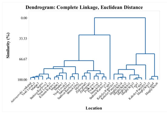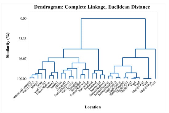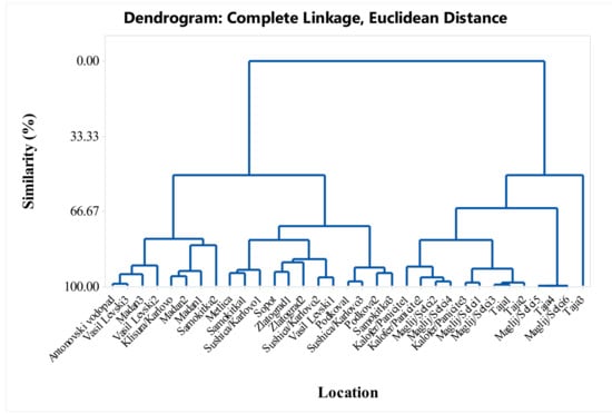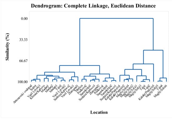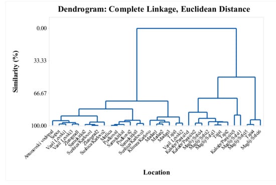 The analyses were completed using the Mixed Procedure of SAS [48]. Since the effect of Location on EO yield and the percent compositions of all constituents and the effect of Chemotype on PNB were significant (p value < 0.05), further multiple means comparison was completed using Tukey’s multiple range test at 5% level of significance, and letter groupings were generated. LC50 values for larvicidal data were calculated by using SAS, Proc Probit. For each response variable, the validity of model assumptions was verified by examining the residuals as described in Montgomery [49], and appropriate transformations were applied on response variables with violated assumptions. The results reported in the tables are back transformed to the original scale. To determine the similarity level of the 33 locations in terms of (1) all 8 constituents; (2) thymol and p-cymene; (3) thymol, p-cymene, and γ-terpinene; (4) carvacrol and p-cymene; and (5) carvacrol, p-cymene, and γ-terpinene multivariate analysis of complete linkage clustering [50] was conducted, and dendrograms were produced.