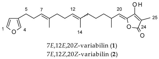 2.1. Isolation and Characterization of 7E,12E,20Z- and 7E,12Z,20Z-Variabilin (1 and 2)