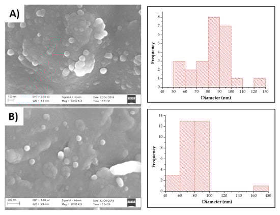 SEM images of Variabilin Loaded Stearic Acid Solid Lipid Nanoparticles (Var-SLNs) (A) and the blank SLNs (B) together with their corresponding diameter histograms.