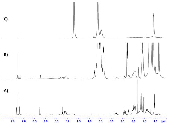 1H NMR spectra (CDCl3, 400 MHz) for mixture of 1 and 2 (A), Var-SLNs, (B), and the poloxamer 188 copolymer (C).