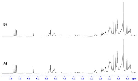 1H NMR spectra (CDCl3, 400 MHz) for the Var-SLNs immediately after purification (A), and one week later (B).
