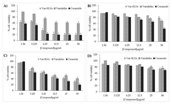 Effect of variabilin and Var-SLNs against cancer and non-cancer cell lines. The cells: PC-3 cells (A), MCF-12 (B), MCF-7 (C), and HT-29 (D) were exposed to increasing concentrations of variabilin and Var-SLNs, cell viability was assessed by WST-1 assay. * Statistical significance (p < 0.05).