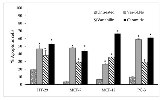 APOPercentageTM results obtained for variabilin (1) and Var-SLNs, together with ceramide (positive control) and untreated cells which served as a negative control. * Statistical significance (p < 0.05).