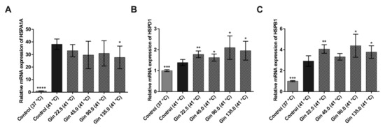 mRNA expression of heat shock protein genes in Caco-2 cells grown under normal temperature conditions (37 °C) or under heat stress (41 °C), without (control) or with the addition of ginseng extract. The final concentrations of ginsenosides were 22.5 mg/L (Gin 22.5), 45 mg/L (Gin 45.0), 90 mg/L (Gin 90.0) and 135 mg/L (Gin 135.0). The expression levels of HSPA1A (A), HSPD1 (B) and HSPB1 (C) are indicated as fold-changes normalized to the control at the normal temperature condition of 37 °C. Error bars are based on the standard deviation (n = 6). **** p < 0.0001, *** p < 0.001, ** p < 0.01 and * p < 0.05 indicate significant differences from the control under the 41 °C heat stress condition.