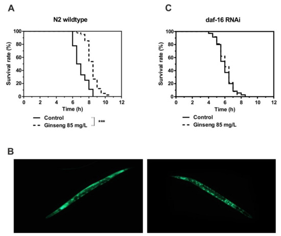 The survival time of N2 wildtype C. elegans at 37 °C in the absence (control) or presence of 85 mg/L ginseng extract was measured as described in the Methods section (A,C). Representative image of daf-16::GFP in strain TJ356 (B). *** p < 0.001 indicates significant differences from the control without ginseng extract treatment.