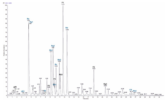 HPLC-MS analysis of 80% ginseng extract. A total ion current (TIC) chromatogram is shown, indicating seven ginsenosides (denoted in black) without and twelve ginsenosides (denoted in blue) with quantitation.