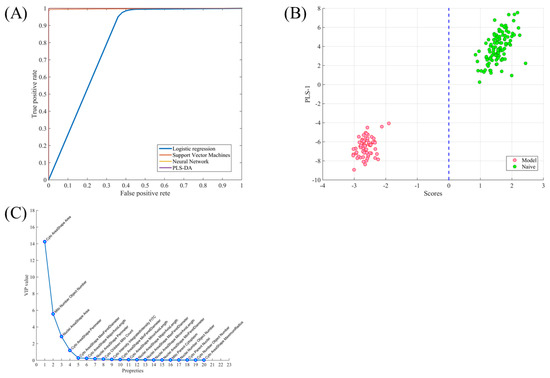 Pattern recognition of model and naïve cells. (A) Receiver operator characteristic (ROC) of four models. The area under the curve (AUC) of Partial Least Squares Linear Discriminant Analysis (PLS-LDA) equaled 0.999, which is the highest of all, and the AUC of LogReg equaled 0.719. (B) Visualization of the test samples according to the PLS-LDA scores vs. the first latent variable spaces. Data from individual images of model cells (models, red dots, n = 65) and naïve cells (naïve, green dots, n = 109) are separated along the horizontal axis. A score below 0 is classified as a model cell. (C) Variable importance in projection (VIP) values with cell properties. This represents the importance of each property in the trained PLS-LDA model.