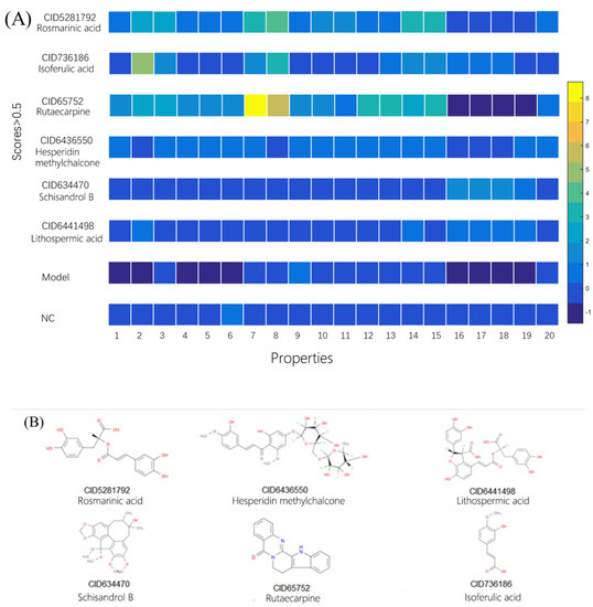 Classification of the effect of natural compounds in model cells. (A) Heat map representing the morphologies of model cells, naïve cells, and model cells treated with the various natural compounds (10 μM, 24 h). (B) Chemical structures of the natural compounds whose scores were more than 0.5.