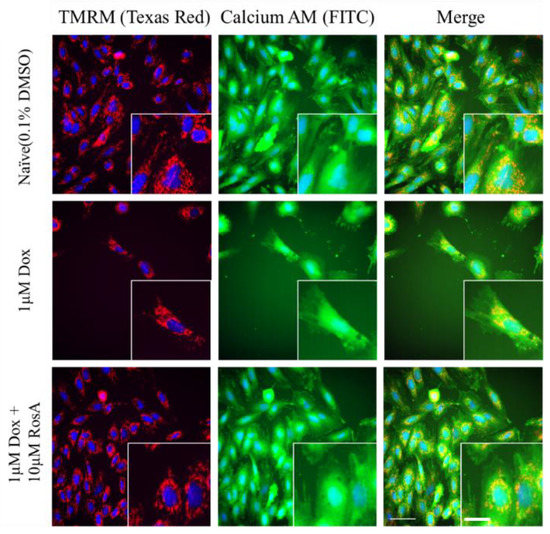 Phenotypes associated with model cells pretreated with RosA. The green fluorescence in the FITC channel is Calcein-AM, the red fluorescence in the Texas red channel is TMRM, and the blue fluorescence in the DAPI channel is Hoechst 33342.