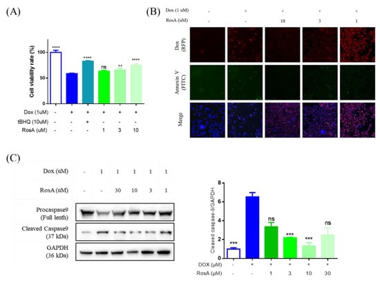 Effect of RosA on Dox-induced AC16 cell apoptosis. (A) The cell viability of RosA-pretreated cells after Dox treatment for 24 h. (B) The green fluorescence is Annexin V-FITC staining positive cells, and the red fluorescence is Dox staining positive cells. The blue fluorescence is Hochest 33342 staining positive cells. Apoptotic cells were stained by green and blue fluorescence, while normal cells were stained only by blue fluorescence. (C) Cleaved Caspase-9 was measured by Western blot analysis in AC16 cells after treatment. GAPDH was used as an internal control. ** p < 0.01, *** p < 0.001, **** p < 0.0001, ns: no significant difference. 1 μM Dox-treated was the model group; 0.25% DMSO-treated was the negative control group, compared with the model group. Results are expressed as mean ± SD (n = 3).