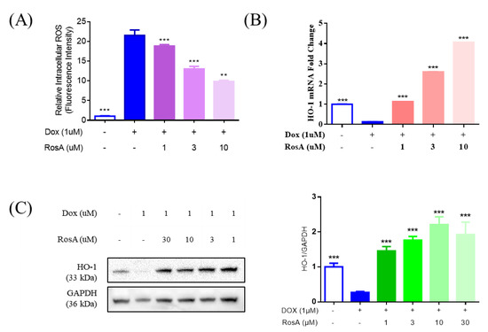 The antioxidant effect of RosA in Dox-induced AC16 injury model. (A) The levels of intracellular ROS were measured by DCFH-DA fluorescence. (B) The mRNA levels of HO-1 were evaluated using real-time polymerase chain reaction (RT-PCR), with GAPDH as the internal control. (C) Levels of HO-1 expression with various concentrations of RosA for 24 h as measured by Western blot, with GAPDH as an internal control. ** p < 0.01, *** p < 0.001, 1 μM Dox-treated was the model group; 0.25% DMSO-treated was the negative control group, compared with the model group. Results are expressed as mean ± SD (n = 3).