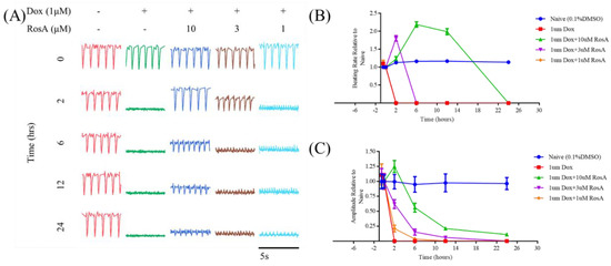 The myocardial protective effect of RosA in Dox-induced dysfunctional cardiomyocytes. (A) Beating patterns, (B) beating rates, and (C) amplitude of dysfunctional cardiomyocytes treated by various concentrations of RosA at selected time points (0, 2, 6, 12, and 24 h). All data were normalized by 0 h. 1 μM Dox-treated was the model group; 0.25% DMSO-treated was the negative control group, compared with the model group. Results are expressed as mean ± SD (n = 3).