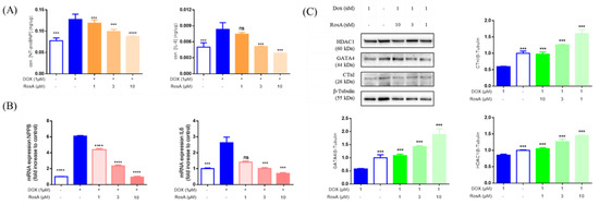To verify the effect of RosA protection on Dox-treated hiPS-CMs, cardiomyocyte contraction assays were performed by an RTCA cardio system. The results demonstrated that treatment with 1 μM Dox resulted in decreased rates of beating and amplitude in hiPS-CMs, as compared to those at the 0 μM Dox baseline. Pretreatment with concentrations of RosA (at 1‒10 μM) led to the maintenance of decreased rates of beating and amplitude (Figure 7). Pro-brain natriuretic peptide (NPPB), Interleukin-6 (IL6), and their mRNA were the major biomarkers of heart failure [25]. Enzyme linked immunosorbent assay (ELISA) and a RT-PCR analysis demonstrated a concentration-dependent decrease of pro-BNP and IL6, which were significantly upregulated by 1 μM Dox (Figure 8). To further study the mechanism of protection of RosA, we performed a Western blot analysis on the expression of encoding cardiac-development-related proteins [26,27,28], including HDAC1, GATA4, and CTnI. After Dox treatment, the expression of HDAC1, GATA4, and CTnI was significantly downregulated. Then, pretreatment with concentrations of RosA (at 1‒10 μM) increased the expression of cardiac-development-related proteins, including HDAC1, GATA4, and CTnI (Figure 8C).