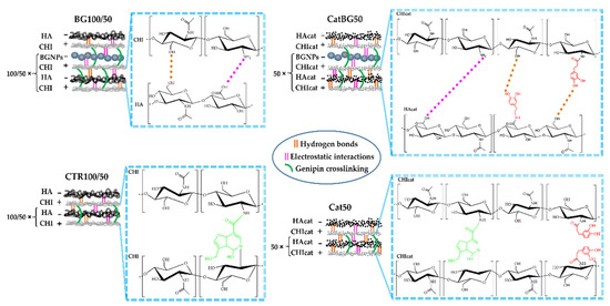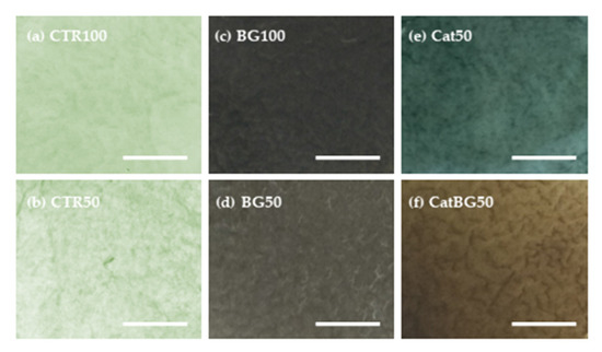 Positively charged CHI (or CHIcat) was initially adsorbed to the inert hydrophobic polypropylene substrate through Van der Waals interactions followed by the adsorption of anionic HA (or HAcat). The sequential deposition of the different oppositely charged PEs resulted in the formation of interdigitated layers bound by electrostatic interactions and polymer entanglements [24]. BGNPs were incorporated within the multilayers by electrostatic interactions due to their negative charge, as confirmed by the zeta potential measurements, and also by Van der Waals interactions. The freestanding films were easily detached from the polypropylene substrate due to their hydrophobicity and weak interactions between the initial CHI layer and the substrate. At the macroscopic scale, the obtained films were homogeneous, had no deformities, and could be easily manipulated with tweezers. However, BG100 and BG50 tended to form cracks during the drying process. Before crosslinking, the polymeric-only films were transparent and, when comprising catechol-modified polymers (Cat50 and CatBG50), displayed a yellowish tone. The films incorporating BGNPs presented a light-grey color, which is characteristic of the particles, indicating a homogeneous dispersion and a good interfacial bonding and interaction between the BGNPs and the PE layers.