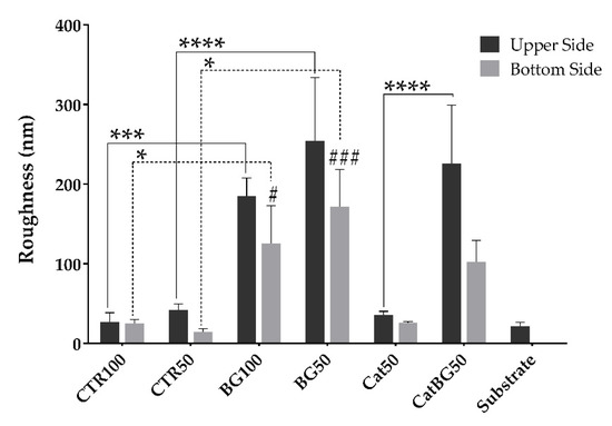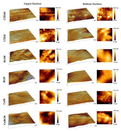 The upper surfaces tended to have higher RMS roughness compared to the bottom ones, which is in accordance with other studies [52]. In fact, the increased roughness can be explained by the significant presence of polymeric loops and tails in the upper side of the films, producing rough surface areas, as visible by AFM. In addition, due to the substrate’s flat topography, the bottom surface was smother [52,53]. Interestingly, the substrate pattern effect (shown in Figure A2) can be particularly noticed on the polymeric-only films with the bottom surfaces displaying similar RMS to the substrate RMS (CTR100 25.42 ± 4.92, and, CTR50 14.50 ± 3.96, and Cat50 25.85 ± 1.86 nm, substrate 21.76 ± 4.47 nm). The same was not observed for BGNPs containing films. Moreover, there were no significant differences in the RMS values determined for films with and without catechol-modified polymers, which is in agreement with the work of Rego and coworkers [30].