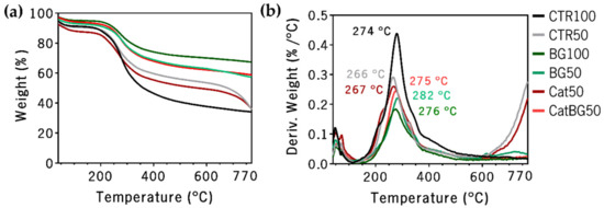 The total residual weight of each sample measured after thermal decomposition at 770 °C was: CTR100, 34.0%; CTR50, 35.6%; BG100, 67.3%; BG50, 57.2%; Cat50, 35.9%; and CatBG50, 58.7%. Higher residual weight was observed for BGNPs containing films, confirming the successful incorporation of nanoparticles within the PE layers. The approximate BGNPs’ weight content of each film was: BG100, 50.5%; BG50, 33.5%; and CatBG50, 35.5%. These results show that the increase of the layer number led to a higher BGNPs’ incorporation. Moreover, CatBG50 presented slightly increased BGNPs’ weight content compared to BG50, due to the presence of catechol groups in CatBG50, which were able to create strong bonds with several materials, including glass [12,27,54]. Rodrigues and coworkers [28] obtained 12% higher BGNPs’ incorporation in dip-coated LbL films comprising HAcat, CHI, and BGNPs than in its control. This discrepancy is possibly related to the films’ assembly technique. In the dip-coating process, the substrate was dipped for 20 min in the BGNPs’ suspension, allowing sufficient time for the BGNPs to establish electrostatic interactions with the pre-deposited layers, while the BGNPs suspension in the present spin-assembly was in contact with the pre-deposited layers without spinning only for 5–7 s. Thus, increased BGNPs’ incorporation may be possibly achieved by increasing the contact time of the BGNPs’ suspension with the pre-deposited layers.