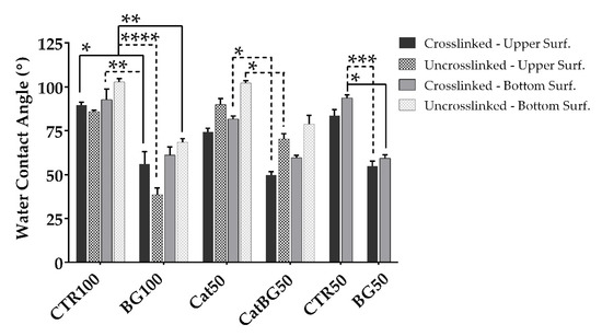 Water contact angle (WCA) measured values of both sides of the films before (except CTR50 and BG50) and after cross-linking with genipin, being the “upper surface” HA/HAcat and the “bottom surface” CHI/CHIcat in all film formulations. Significant differences were stated for p < 0.05 (*), p < 0.01 (**), p < 0.001 (***), and p < 0.0001 (****). Straight line represents the significant differences between equivalent surfaces and in dotted lines those between opposite surfaces (i.e., upper-bottom).