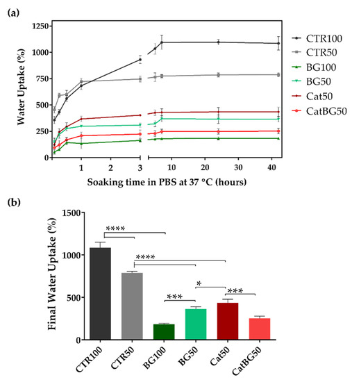 Facing these results, CatBG50 presented the advantage of a lower weight loss rate, avoiding this problem while maintaining its bioactive character. Moreover, the stiffness and roughness increase and water uptake decrease also contributed to an enhanced cellular behavior, since cells tend to prefer stiffer and lower hydration surfaces [52,76,84].