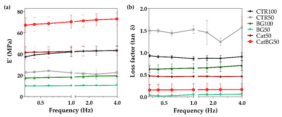 The mechanical and viscoelastic properties of the freestanding films were evaluated by DMA. The storage modulus (E′) and the loss factor (E″/E′) as a function of the tensile loading frequency is presented in Figure 11. The results evidence an increase in E′ with the frequency increase for all the LbL films studied (with the exception of CTR50), a particular behavior of viscoelastic materials [66], being in agreement with other works [52,67]. Such increase was more pronounced for CatBG50, which also reached the highest E′ values (73.13 ± 5.6 MPa), suggesting that the synergetic effect of the catechol groups and the BGNPs’ incorporation resulted in an increased film stiffness, reaching values 6.8 and 1.7 times higher than BG50 and Cat50, respectively. The inclusion of catechol groups revealed to be crucial in increasing films’ stiffness, given that Cat50 reached E’ values 1.9 times higher than CTR50 and comparable to CTR100.