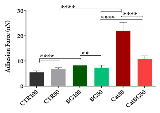 Adhesive force of the LbL films determined by AFM in dry state. Significant differences were found for p < 0.01 (**) and p < 0.0001 (****).