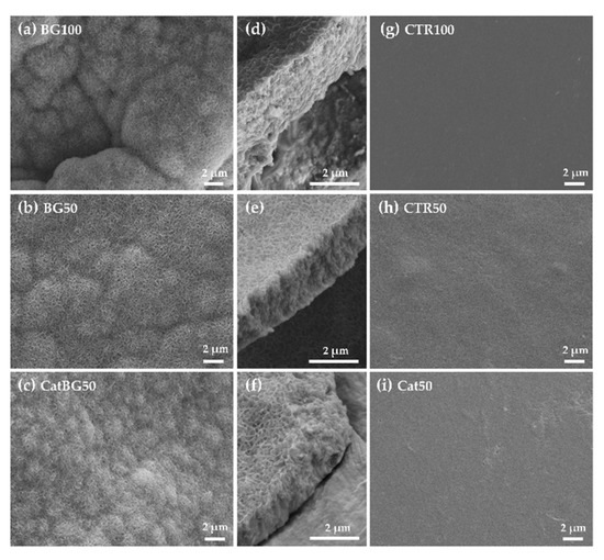 As it was hypothesized, catechol-containing films led to the construction of thinner films. CatBG50 were thinner than BG50, suggesting that the combination of catechol-modified polymers with BGNPs may be responsible for more compact LbL films, accordingly with other studies [30,31]. The cross-section of the BGNPs-containing films showed some porosity, which was much reduced in the case of CatBG50 compared to BG100 and BG50, revealing the more compact structure of CatBG50 films. Nevertheless, such porosity could be beneficial for biomedical applications, for example, to enhance nutrient transport to cells or to increase the surface area.