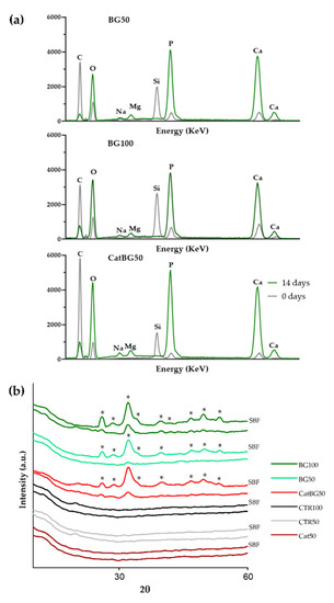 XRD experiments were performed to have a deeper insight on the nature of the formed calcium phosphate layer (Figure 14b). The XRD spectrum of all films before SBF immersion essentially exhibited an amorphous profile. After 14 days of immersion, the XRD data revealed a series of diffraction peaks associated with apatite (Figure 14b), i.e., the XRD patterns had the typical hydroxyapatite diffractogram, as previously reported in other works [29,30]. So, it can be concluded that XRD, SEM, and EDS results confirmed the bioactive behavior of the BGNPs containing films, essential for the formation of new bone, which is of utmost importance for their potential application as GTR membranes [55,71].